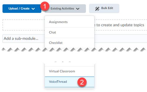 - Select the Existing Activities button (Fig 3.1) and then select VoiceThread from the menu (Fig 3.2).