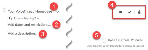 - Select the topic name to change it (Fig 6.1), select Add dates and restrictions... (Fig 6.2) to add/change them, select Add a description... to do so (Fig 6.3). Use the three icons in the upper right (Fig 6.4) to hide, require, or delete the topic. If you want the homepage or course view to open in a separate browser tab, select the Open as External Resource checkbox (Fig 6.5).