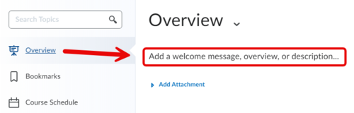No, instructors are not required to include either a description or attachment in the Overview feature. If left empty, the heading, "Overview," will not be visible to students and they will instead be directed to the first item on the TOC. Instructors will always be directed to the Overview when they access the Content tool and they will see a blank content region if it's empty.
