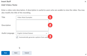 Step 6. Enter a title (Figure 4.1) and description (Figure 4.2). Select the language (Figure 4.3) and check the box for captioning (Figure 4.3).