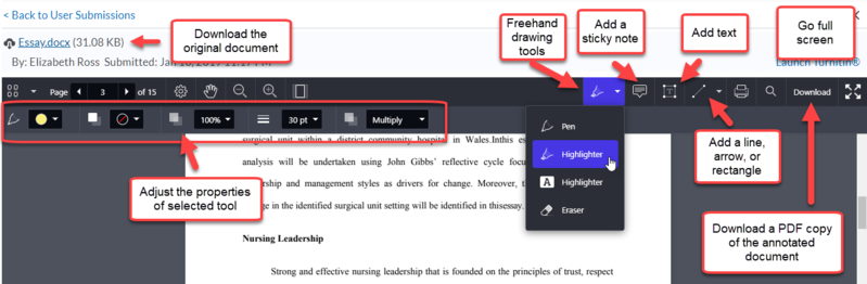 Annotate a Brightspace assignment submission submitted to an assignments folder in a Brightspace course to provide quick feedback to students without having to open their original documents. Available annotations include freehand drawing, highlighting, and comments (e.g., sticky notes). Once published, students can see your annotations and download a PDF copy of their document with your annotations included.