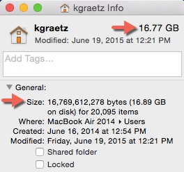You can use the same method to check the size of your entire Home folder, the one that probably holds all of your school-related and personal files. You access your Home folder buy double-clicking your hard drive icon and selecting the Users folder. Your Home folder is the one with the house icon with your username underneath it.