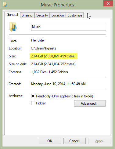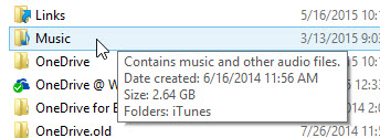 - Mouse-over the folder name. The tool tip will usually display the size of the folder. In Figure 2, I am checking the size of my Music folder via the tool tip. It's 2.64 GB.