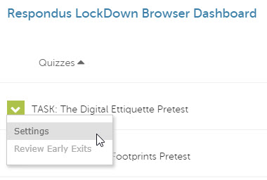 - To modify the settings for a specific quiz, select the down arrow to the left of the quiz title and select Settings (Fig 2). This expands the list of the LDB settings.