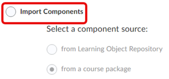 - Select Import Components either from the D2L Learning Object Repository (LOR) or a course package. If importing zipped content, "Browse" for a file before proceeding.