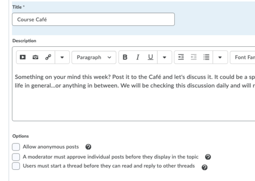 6. Title your topic for the forum, enter the discussion question in the Description box. If you want your students to post their reply before seeing other students' replies, scroll down and click the box that says Users must start a thread before they can read and reply to other threads.