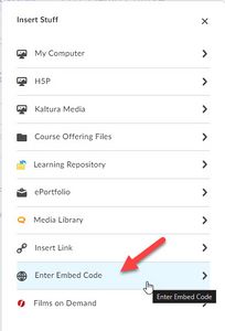 - Some applications on the Insert Stuff list are already integrated with the Brightspace HTML Editor (e.g., Kaltura Media, H5P, Films on Demand). Although these applications allow you to copy embed code, you don't need it when you use the integration instead.