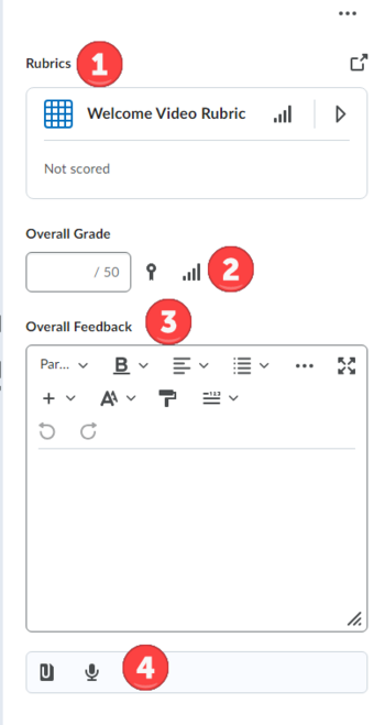 - On the right side of the individual student view you can pull up a rubric that is associated with the Assignment (see Fig. 1.1), enter total points (Fig 1.2), enter text feedback in the textbox (1.3), if you downloaded it and made edits to the submitted files you can upload that version by using the Add a File button (1.4), and a short audio feedback file can be recorded by clicking on the Record Audio button (1.4).