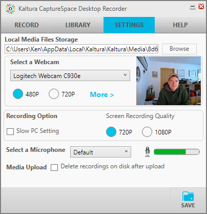 - In the Kaltura CaptureSpace Desktop Recorder window, select the Settings tab (Fig 2)