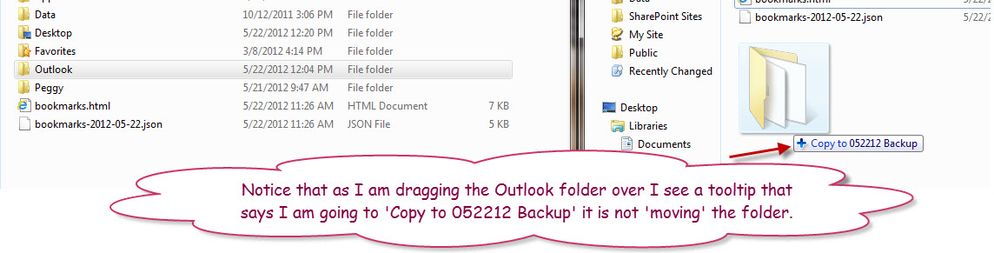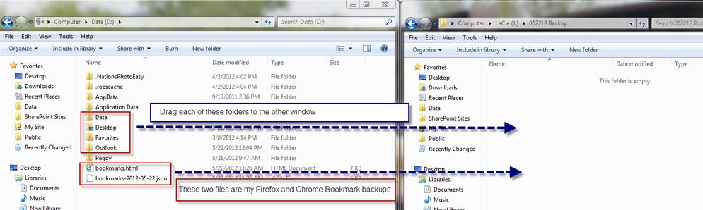 - To do a full back up of your laptop you will want to drag all four of these folders (Data, Desktop, Favorites and Outlook). You may need to drag other folders or files to the backup folder. I have a folder called ‘Peggy’ with personal documents that I would also drag over to my backup folder. The table also describes other items that you may need to back up, so make sure that you read this over carefully.
