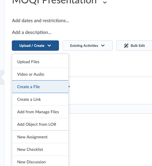 This article includes instructions for creating a new topic in a D2L course table of contents (TOC) by uploading a file.