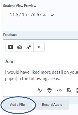 - Make comments on the document or artifact and upload within the individual submission (Fig. 3) by clicking on the Add a File button below the Feedback box.