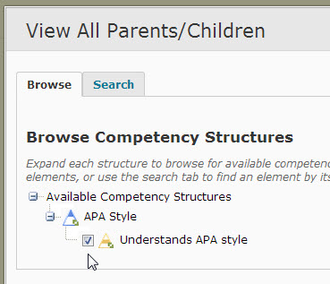 3. Expand one of the available competency structures by selecting the "+". Note that you can also search from among all available learning ojectives by selecting the Search tab.