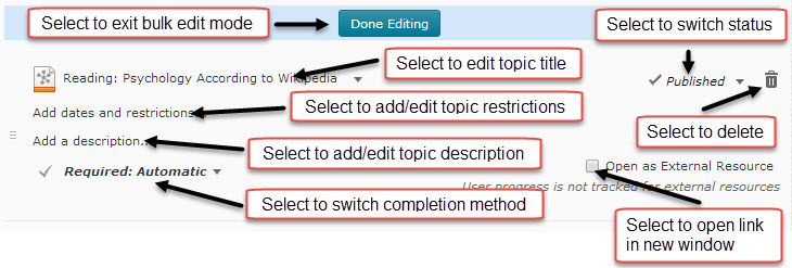 Every topic in a D2L table of contents (TOC) has a number of common properties or features that can be changed to meet instructional needs. They include: