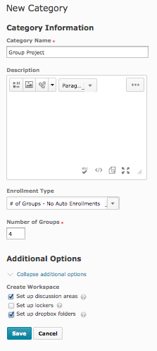 - Depending on your selection in the Enrollment Type menu, you will be asked for the Number of Groups or Number of Users. Enter the appropriate number. In our example at right, we have said we want 4 groups and we will enroll the students in the groups ourselves.