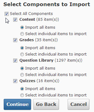 - If you elected to select individual items to import for any of the components, you will be presented with a list of items for each component. Select the items you want to import and click the Continue button to advance to the next component. Note that you may need to select the "+" icon next to the different categories that are listed to expand the list.