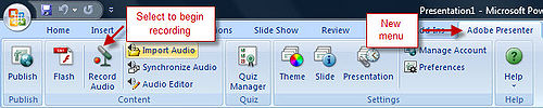 Adobe Presenter is a plug-in for PowerPoint (PC) that allows you add audio narration to your PowerPoint slides and publish the resulting content in a very usable and web-friendly format. Presenter is superior to the narration function native to PowerPoint in a number of ways: