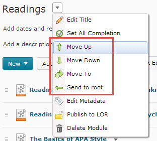 - Move To - This function allows an instructor to select a parent module to which to move a sub-module or topic.