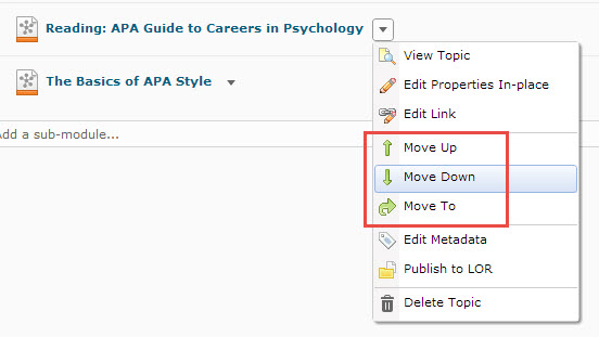 - The move options displayed in the Actions menu are dependent on the current position of the module or topic. For example, if the topic is already in the first position, Move Up will not be listed as an option.