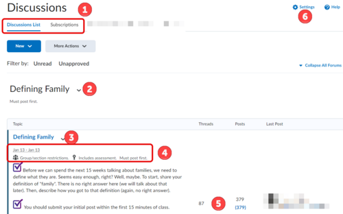 - Item 1: The discussion navigation menu includes the list of discussions and a link to discussion subscriptions.