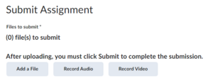 The Brightspace Assignments (formerly Dropbox) tool is an electronic storage space where students can submit documents and assignments. Assignments will take most file formats including Word, Excel, PDF, and PowerPoint. For multimedia files, use MediaSpace. Submissions are date- and time-stamped. Students will get an email once they have submitted a file to the Assignments folder.