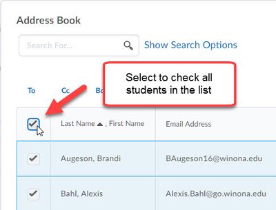 - Select the Address Book button to open the Address Book window. Scroll down to see a list of all of your students.