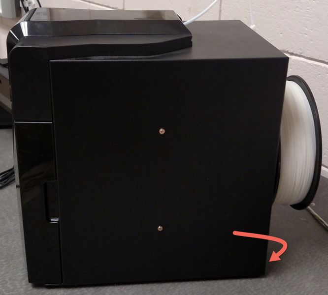 Side View of UP Mini 3D Printer With Arrow pointing to PWR switch.