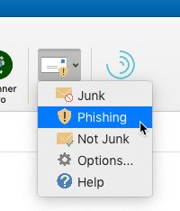 - In the installed, desktop version of Outlook, select Phishing from the Report Message menu on the Home ribbon while viewing the message (Fig 2)