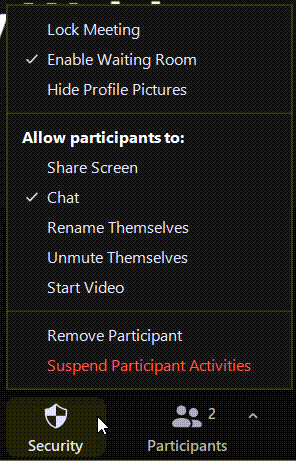 If you decide to deal with things on the fly, without ending the meeting, Zoom hosts and co-hosts can select the Security button at the bottom of the meeting window to access a menu of useful functions very quickly. This includes: