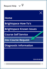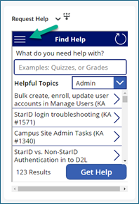 Step 1: At the bottom of the main Brightspace page, go to the menu (three horizontal lines in the top left corner) in the Request Help widget (Fig 1).