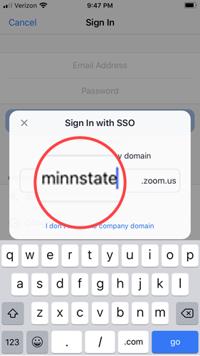 - Enter minnstate as the domain (Fig 9) and tap Go. Your default browser will open to the StarID sign in page.