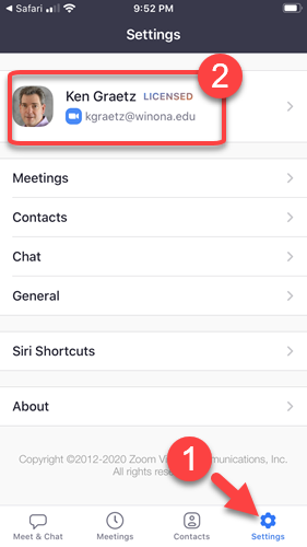 - Tap the Settings tab (Fig 12.2) to verify that you are "Licensed" and your full name and Winona State University email address are displayed.
