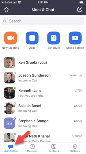 - The Zoom mobile app will open to the Meet & Chat tab (Fig 10).