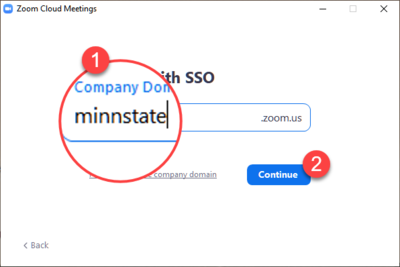 - In the Sign In with SSO window, enter company domain minnstate and .zoom.us (do not use .zoomgov.com) (Fig 4.1) and select Continue (Fig 4.2). Your default browser will open to the StarID sign in page.