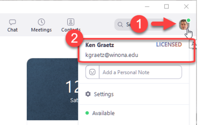 - The Zoom application will open to the Home tab (Fig. 5) and you will be signed in. Select your avatar (Fig 6.1) to verify that you are "Licensed" and your full name and Winona State University email address are displayed (Fig. 6.2).