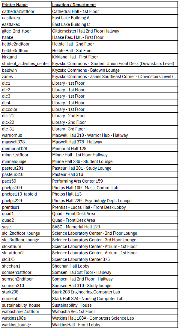 Here is a list of printers available to Winona State University students for printing on the Winona Campus.